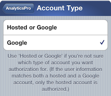 To change the setting, press the blue Disclosure Button or tap the 'Account Type' row. This will display the "Account Type" screen where you can select either "Hosted or Google" or "Google".